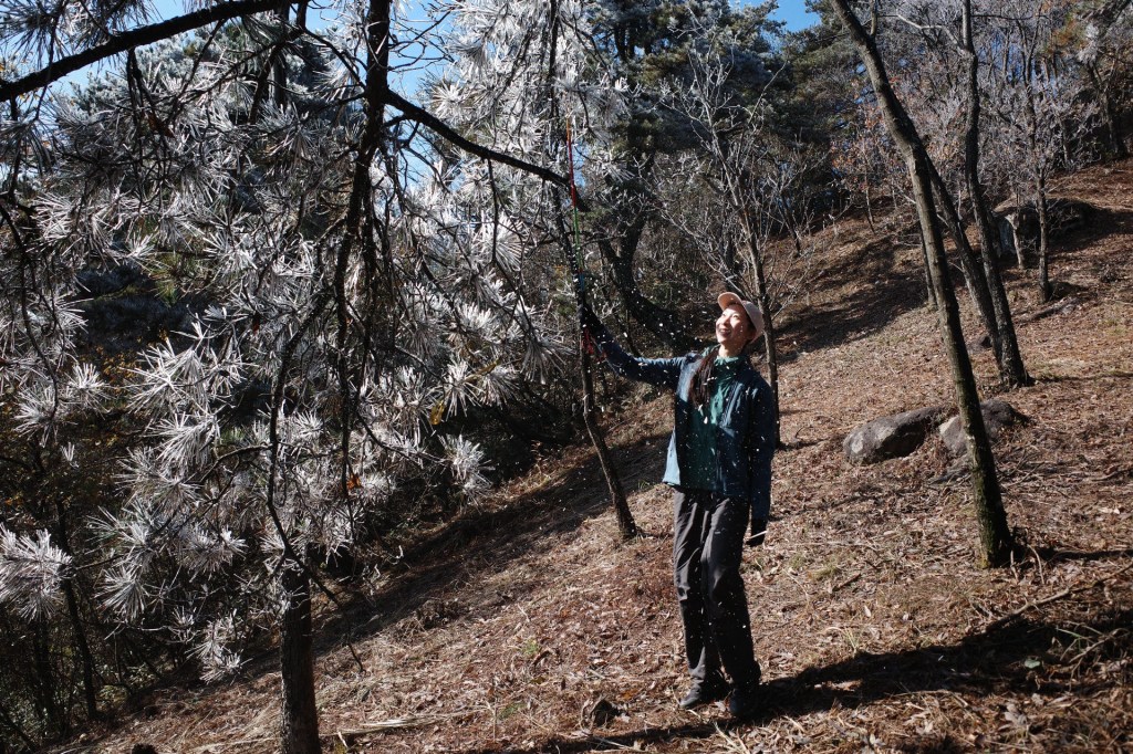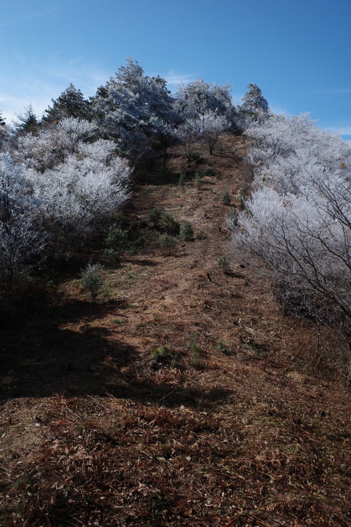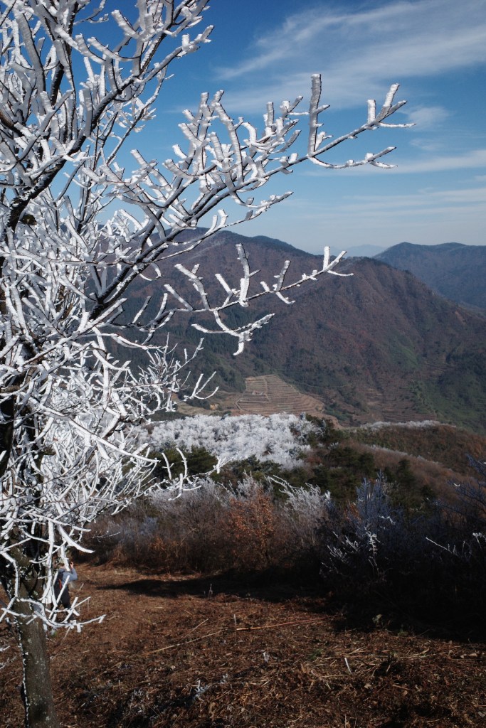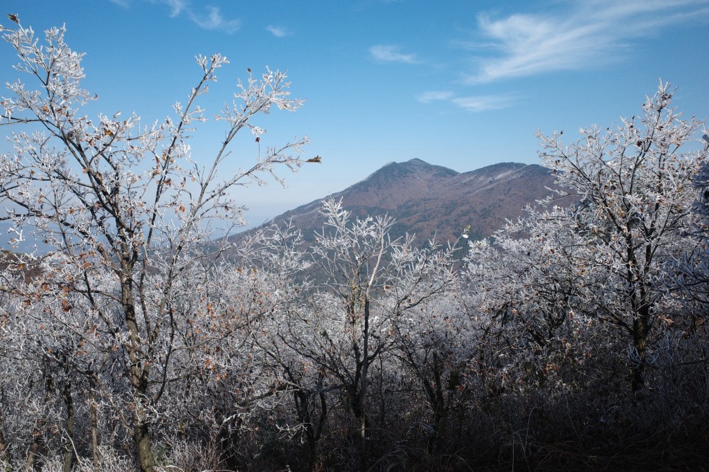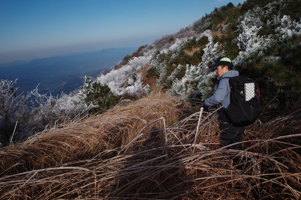 继续前行,望着不远处更高的山尖,难道那个才是螺狮尖?所以爬了半天我们连第一个尖都没到?这真是令人有点泄气啊。不过前一秒还在担心进度的我,后一秒就被眼前的景象给吸引了:举目望去,远处的山坡上覆盖着一层白色的冰霜,合理猜测昨天山下下了点雨,山上一定下了雪。再走几步,竟然看到了树上挂满了不期而遇的雾凇,大家都难掩兴奋之情掏出手机相机开始各种拍照…