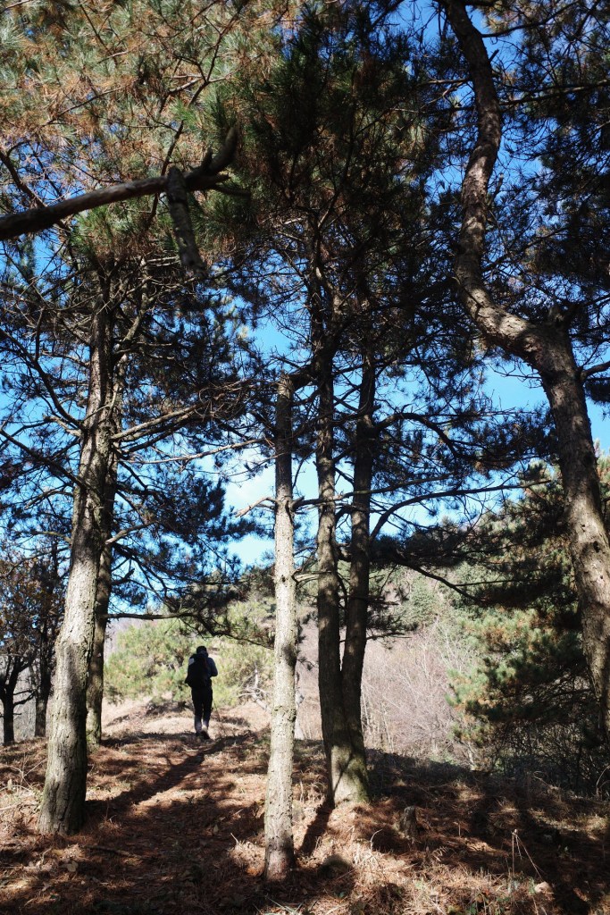 接下来就是沿着相对平缓的防火道前行,视线逐渐开阔,萧瑟的山坡上偶尔遇见几株在山间傲然挺立的迎客松,既挺拔又舒展优雅,令人忍不住按下快门。
