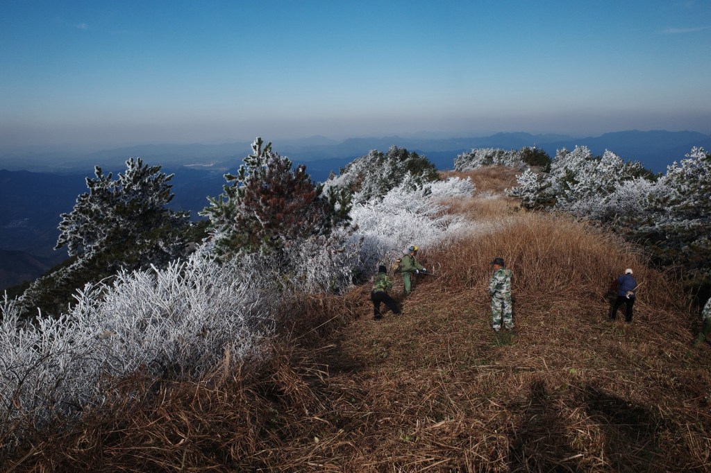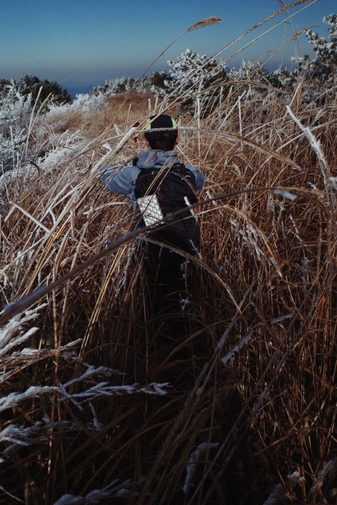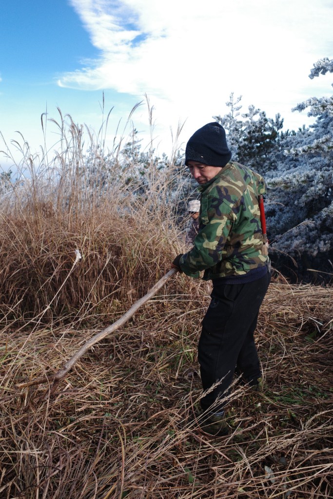 终于到了阳山尖,原来这里才是此次环线的制高点。登高望远,远处苍茫群山和近处挂满霜花的树林尽收眼底,能抽到这样的盲盒,再冷再累也值了。其实如果没有这雾凇的加持,深秋时节的这条线路还是太萧瑟了点。只是这一路走来雾凇也看麻了,新鲜感一过,山顶的冷风一吹,就想尽快撤离。突然听到前方传来机器的声音,走近一看,原来是几个村民正在割芦苇。在他们的身后是被割之后的平坦大道,而在他们的前方则横亘着一望无际的芦苇荡。当时并没有意识到,这就是我们要打的怪物副本。