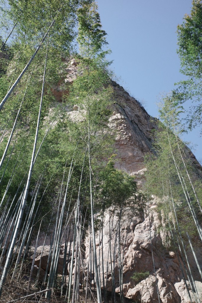 最意外的是,原来龙上村就是攀岩小镇呀,一直听说,今日却误打误撞来到这里。通向狮子岩要走20来分钟台阶,伙伴们直呼今天走不动了留在入口处的竹林晒太阳,我来都来了肯定要前去打探一番。在竹林中拾级而上到狮子岩,现在是淡季,岩壁下只有两个岩友在爬,和他们浅聊一下,虽然这里和阳朔不能比,但也已经是江浙沪一带最大的室外岩场了,加起来有200多条线路吧。只是免不了吐槽到这里攀岩先要爬20分钟台阶实在是有点烦人,哈哈,不过我想这不就正好当作热身了嘛。