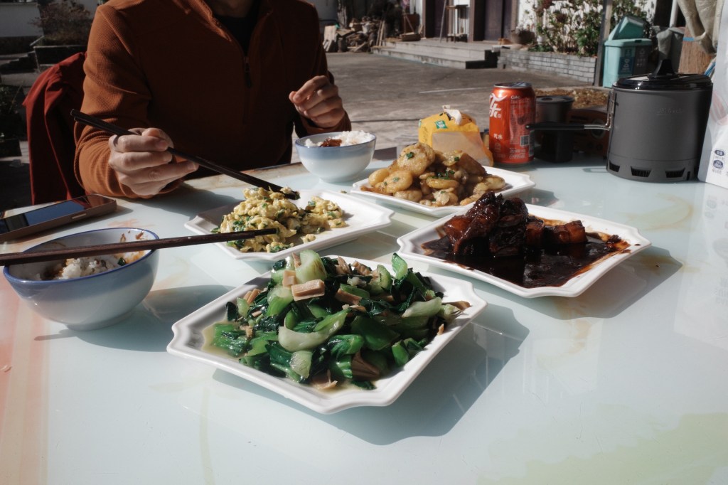 午餐在林家塘村的农家吃的,地处大鱼线和双水线交汇处,这里270度的视线堪比观景台,群山尽收眼底,老板娘的厨艺也不错,闭眼点了四个菜全都光盘。这个位置真是占尽天时地利,想来周末肯定停车位都没。不过此时,就我们仨,吃饱喝足,晒着背,享受这宁静的深秋午后。
