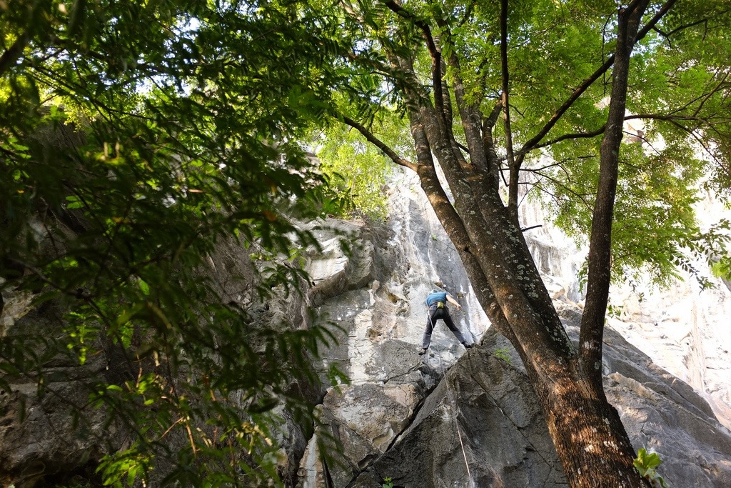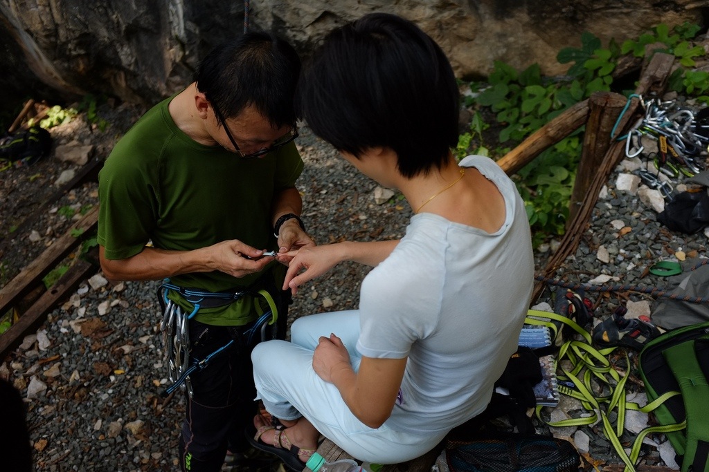 在难题在的这段时间一共去了一次室内两次室外爬墙,也是我第一次尝试野攀。在山上爬和在室内是完全两种感觉,且不说自然的岩体很少有岩馆里那些可以用整个手掌握住的手点,必须依靠更多指尖的力量和腿部的力量。很多时候整个身体就只靠着脚尖支撑起整个身体站在山上,因此虽然同样有保护,但是那份不安全感却强烈得多,所以难题说得对,力量和技巧都在其次,关键还是心理问题。说起来我第一次野攀竟是在清迈,还是和之前完全不认识的朋友的朋友,想想还是觉得好神奇。还遇见一个很神的美国女人,下个月就生产了还在爬墙啊,美国人果然很疯狂啊!