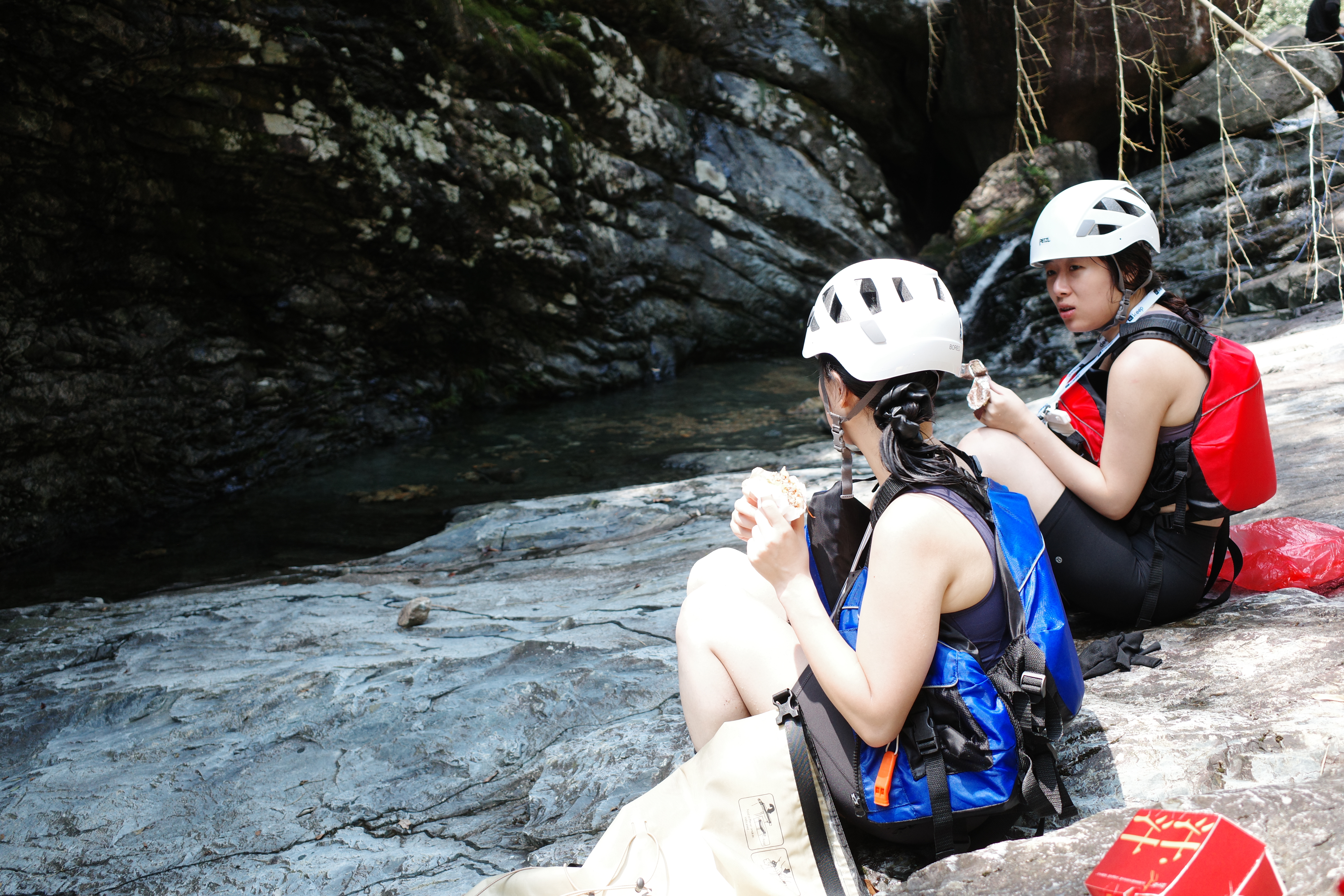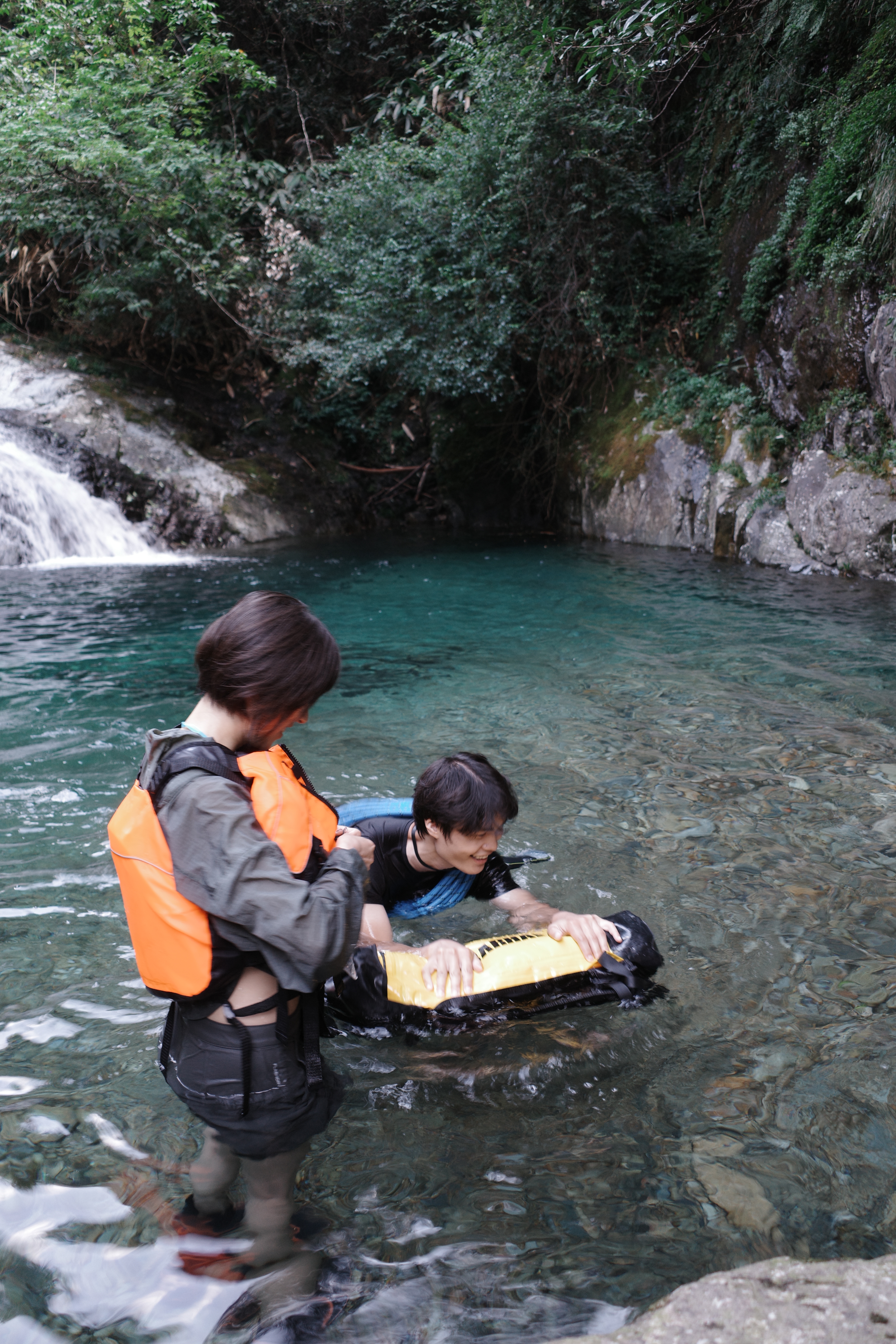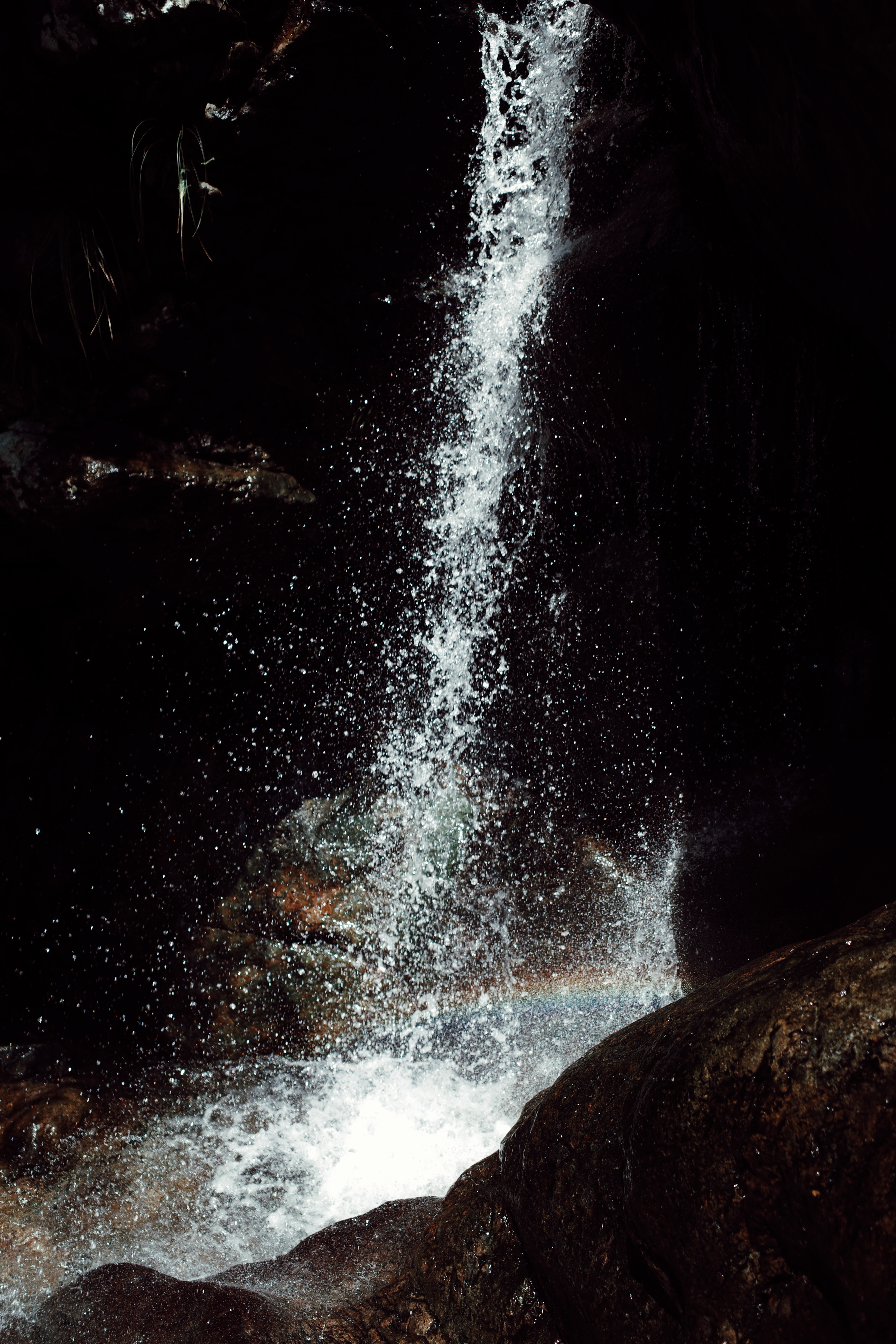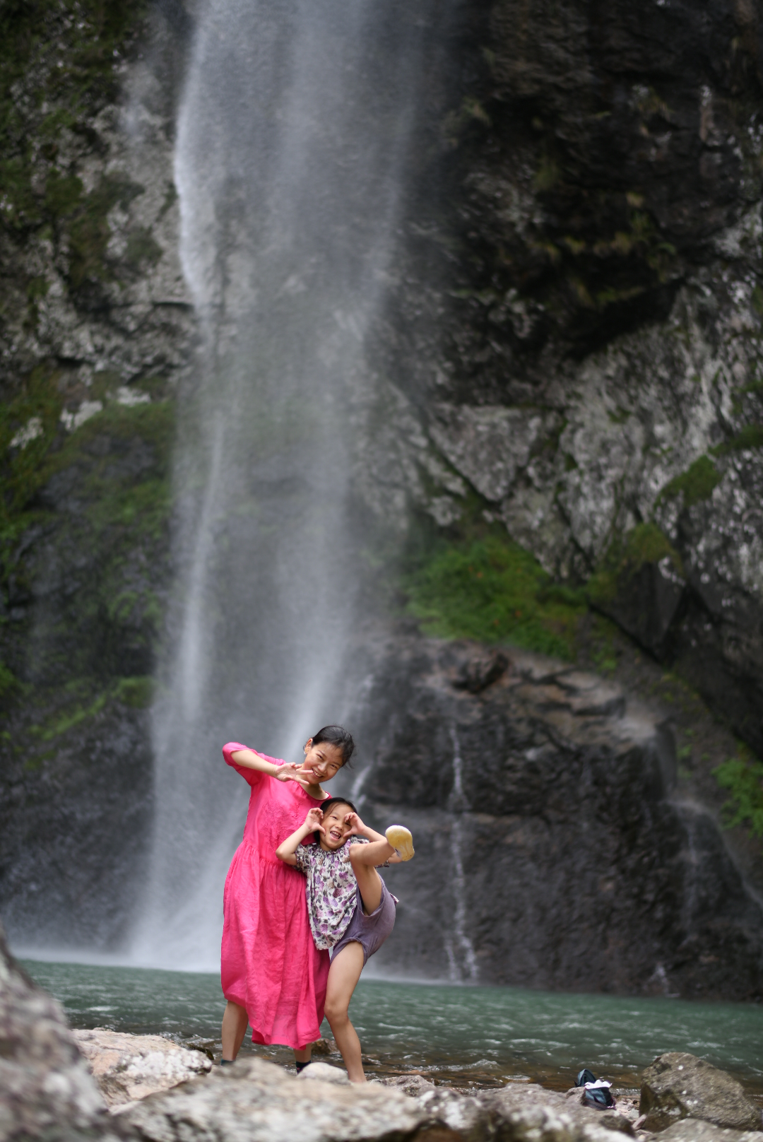 突然听到一阵喧闹的水声,山回路转,豁然开朗,大碏门瀑布就这么大大方方地展现在我们眼前,瞬间被惊艳到了。我其实从来不是一个对瀑布特别感冒的人,但是眼前这条却长在了我的审美点上,悬崖的高度,水量都比我想象中壮观,但是壮观中却不失仙气。和江浙一带的布满植被的山体不同,这里的山能看得见裸露在外的岩石,点缀着青苔的灰褐色岩石,配上银白色的瀑布,和瀑布底下碧绿色水潭,颜色的组合令人极度舒适。而且得益于瀑布吹来的水汽,这里的温度起码比来路低了5度,大家可以安安心心在这无人的清凉山谷呆上一会,玩水的玩水,拍照的拍照。这一刻,除了我们几个,没有其他游客,我们好像承包了这隐秘在半山腰的瀑布和它所在的这个山谷。我躺在岩石上,望着倾泻而下的瀑布源源不断地冲向碧潭,在高处因为紧贴岩石还保持着水流的形状,在低处则如烟如雾,飘飘渺渺,那一刻,我真想把这气韵生动的一幕深深刻在我的脑海里,于是放下相机,目不转睛地望着直到离去。