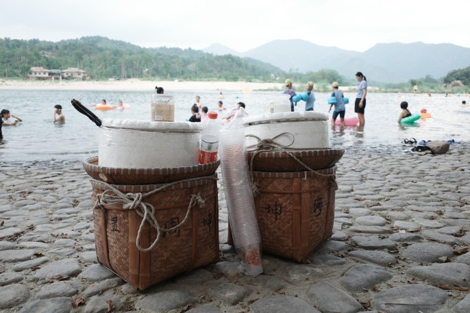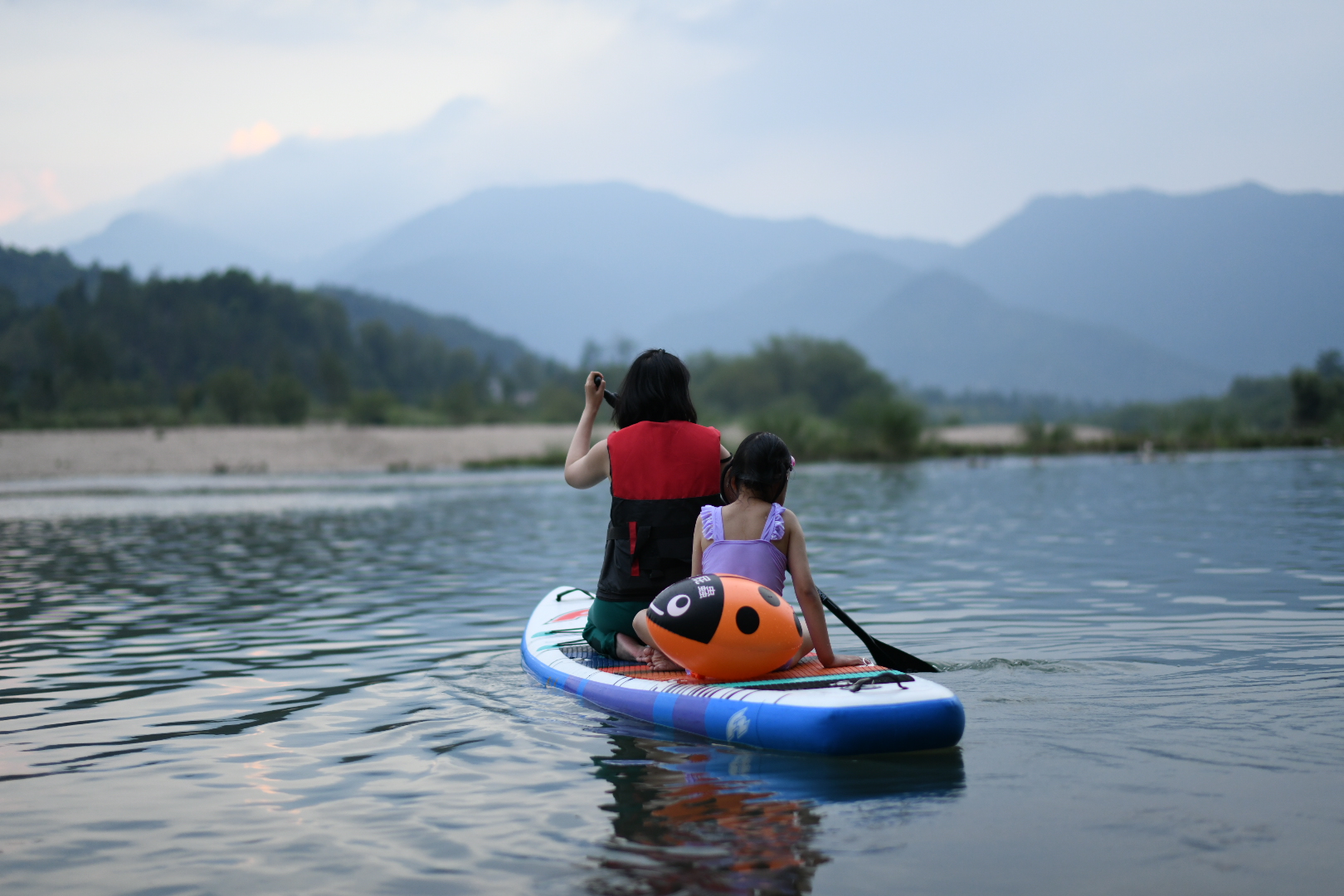 中午去了燕子前同事推荐的附近古村落里的一家本地菜,很合大家的胃口。酒足饭饱后去了楠溪江的狮子岩这一段,燕子被同事推荐了那里的一家网红咖啡馆 — 桃咖啡,装修考究,但是音乐和酒吧一样整耳欲聋,店员说在调试设备…我和燕子在户外区域坐了会,因为就在江边,望着对岸的江滩,椰子树,建设中的吊脚楼,竟让我觉得像东南亚的小岛。 来都来了,就坐下竹筏漂流吧,感觉比阳朔便宜哈哈。 漂的时候看见山上有一家源咖啡,那才是无敌江景咖啡屋啊,留待下次吧。漂流之后,答应了小艾让她下水游泳,我们几个只能无所事事作陪。看到有游客带着桨板来玩我也心生羡慕,后来得知是本地人带来出租给游客的,那必须在楠溪江上体验一把啊。我从跪姿开始适应,颤颤巍巍地站了起来,虽然腿有点抖,但是基本还能站稳。不过江风渐起,水面泛起波浪,我划了半天发现依然原地打转,想起厦门那次,还是老老实实地又跪了下去回到岸边。随后我招呼小汐来尝试一下,令我意外地是她倒还挺享受的,虽然不敢站着划。