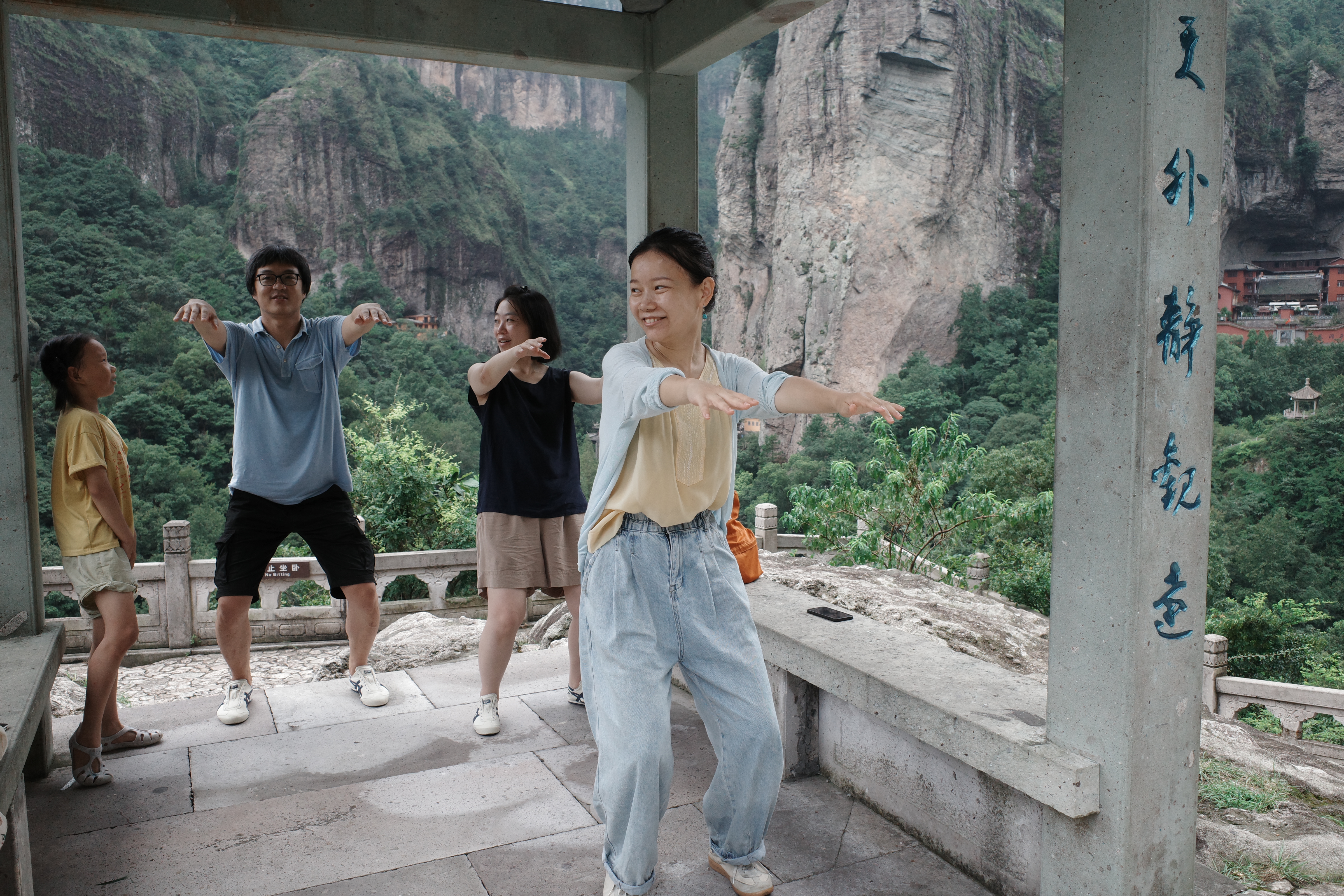 没有走多远,看到一家洞穴中的饮品铺子大家便一屁股坐下喝饮料休息了,喝完饮料当他们在讨论是继续往上还是往下的时候我真是无语了,这不才刚刚开始嘛,燕子说,就算现在就打道回府她也觉得已经圆满了,我真是哭笑不得。喝完饮料走几步来到一个亭子,刚刚从武当山回来的小艾在这里教大家打起了太极,一套动作配合着口令倒是有模有样。