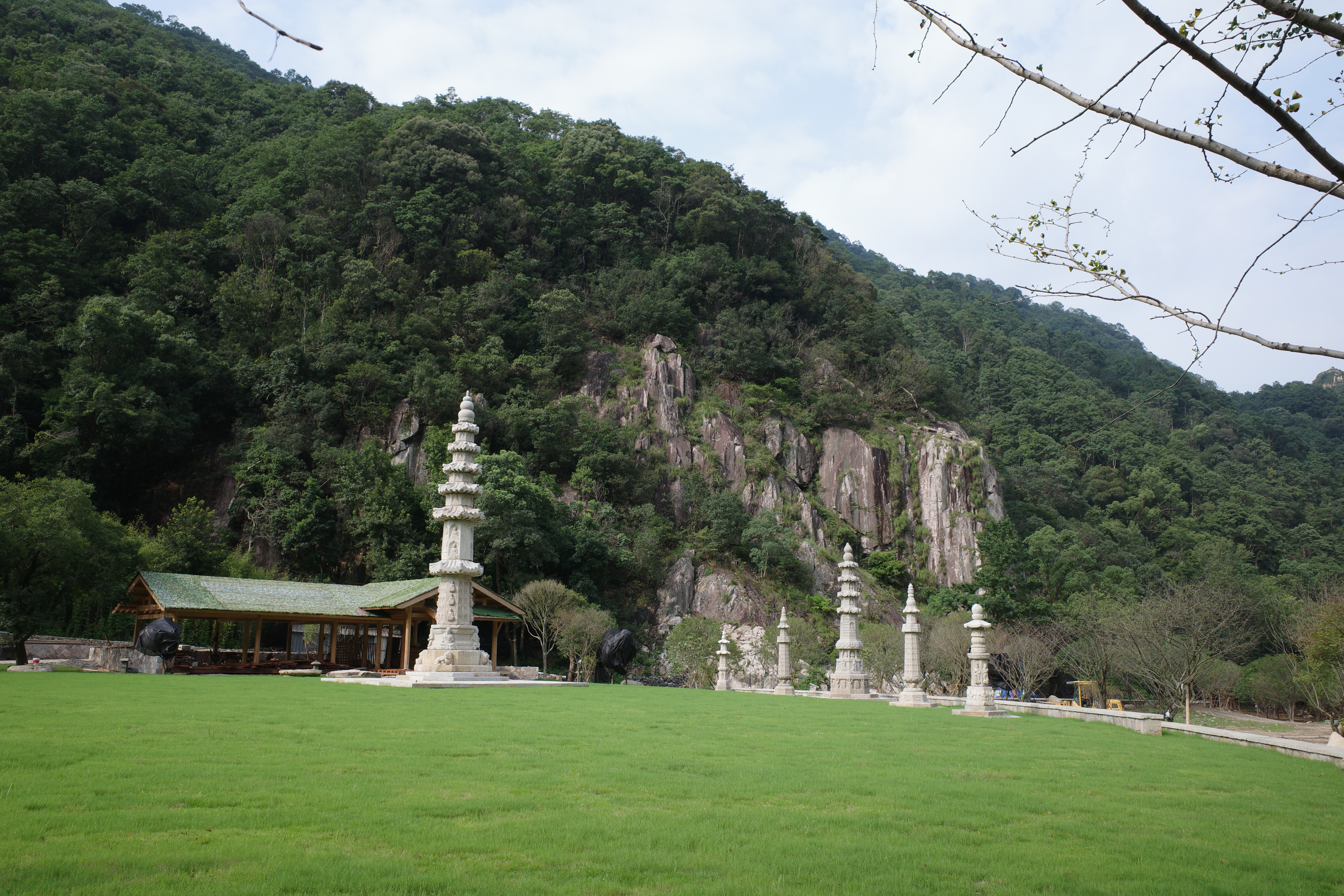 之后大家本想去对面的道观看看,不曾想溯鸣玉溪而前行的这条石板路特别清幽,令我停不下脚步,越走越远却误打误撞来到一座还没正式对外开放的禅寺 — 真济寺。走近寺院,首先印入眼帘的是寺庙外背对山壁的大片绿茵和一座石塔塔,通往寺庙的步道平整精致,长方形的青石板铺在砾石上,两边夹道而植的参天大树绿意森森,可见是很久前种下了,树下有一排石灯笼,走到山门外,木质结构的建筑,砂石,苔藓,错落有致的树木,透露着明显的日式禅院的调调。一位义工特别热情地欢迎我们,告诉我们真济寺始建于宋代,在之后的岁月里几次被重建又被废弃,而现在的建筑是济群法师于2018年开始重建的,着力打造一个静心文化空间,非常有别于传统的那种香火鼎盛的寺庙。国内的禅寺我到访地不多,唯一有印象的便是厦门的南普陀寺,同样是靠山的地理位置,木质结构的大殿,但是建筑风格是庄重的中式风格融合了闽南地区的飞檐斗拱,而眼前的这座则充满禅意。
