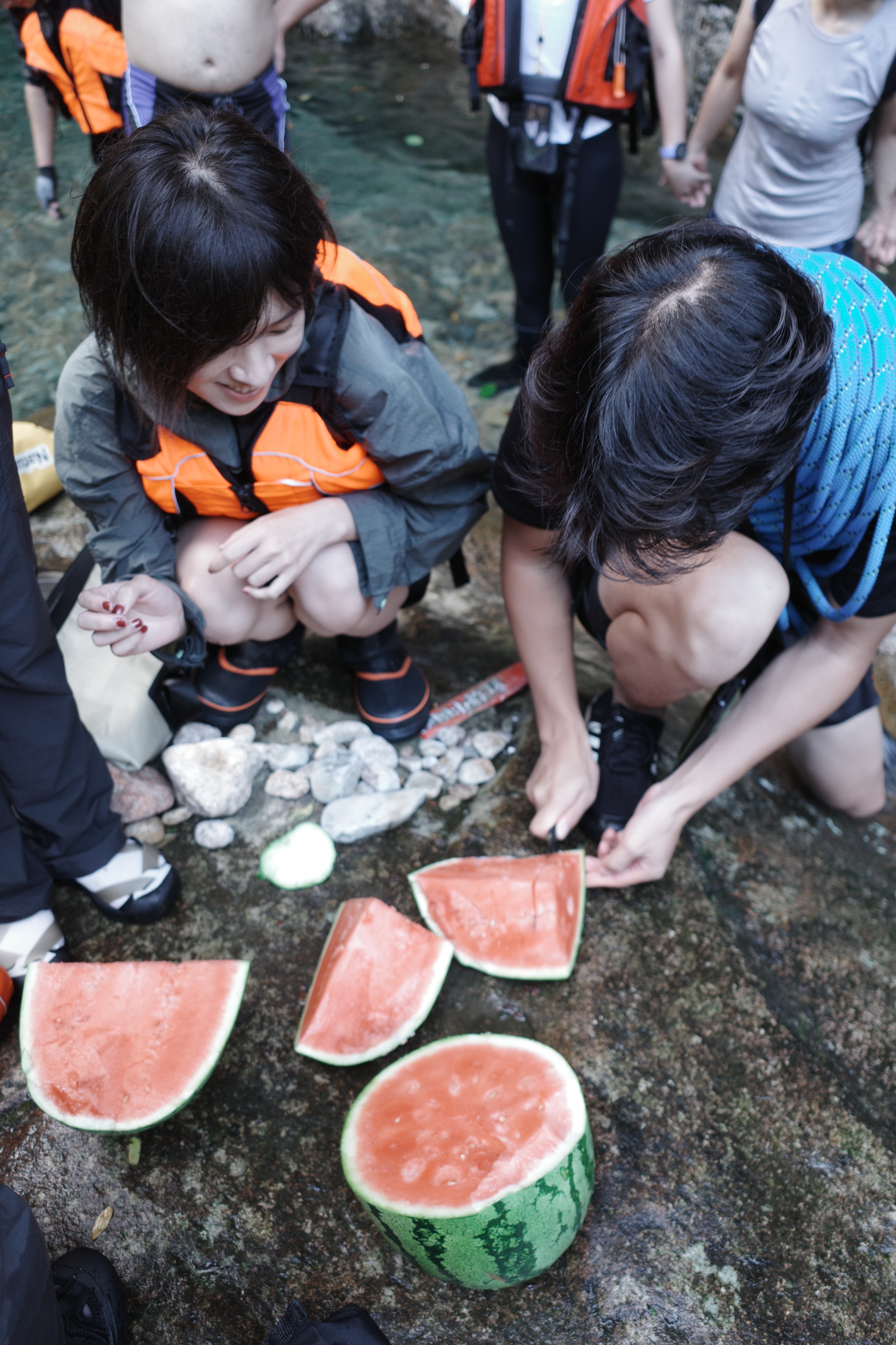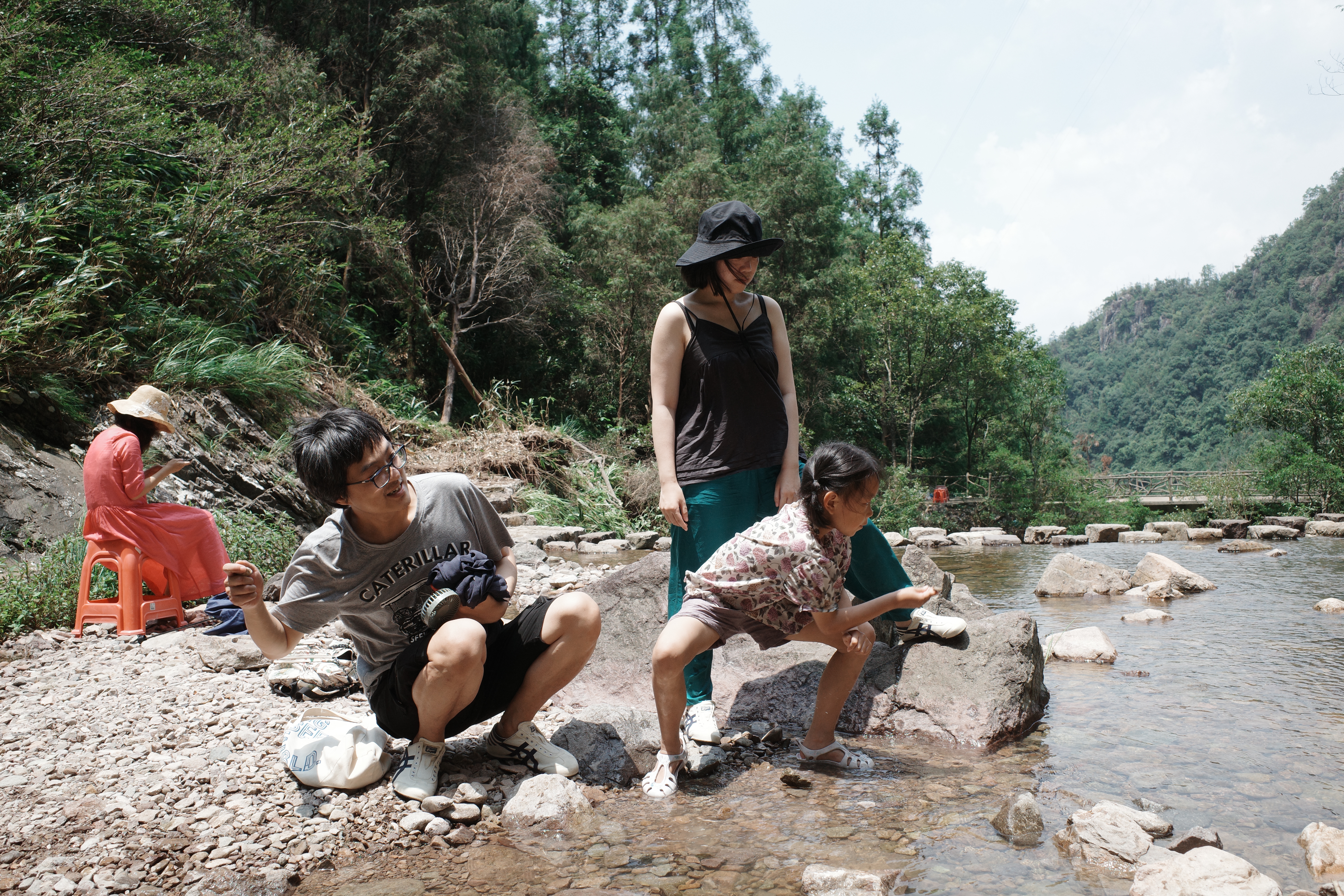 走到了小路的尽头,开始沿着盘旋而上的步道上山。其实栈道左边是一条绿意浓浓的溪涧,乱世堆叠,潺潺流水, 这条玉带溪比起昨天景区里的鸣玉溪多了不少野趣,但是我无心欣赏,烈日炎炎下,一个10岁孩子,一个容易中暑的宅女,一个同样为宅男老公,还有一个全靠意志力撑着的孩子她妈,我时刻担心着他们会被这高温劝退,于是没走几步就小心翼翼地问,你还好吗?步道的尽头看着还远在天边,我也不知道瀑布离我们还有多远。于是我说你们原地休息,我先跑快点去探探路,幸运的是有人扛着三脚架下来,告诉我们没多远就到了,大家这才放下疑虑有了前行的动力。