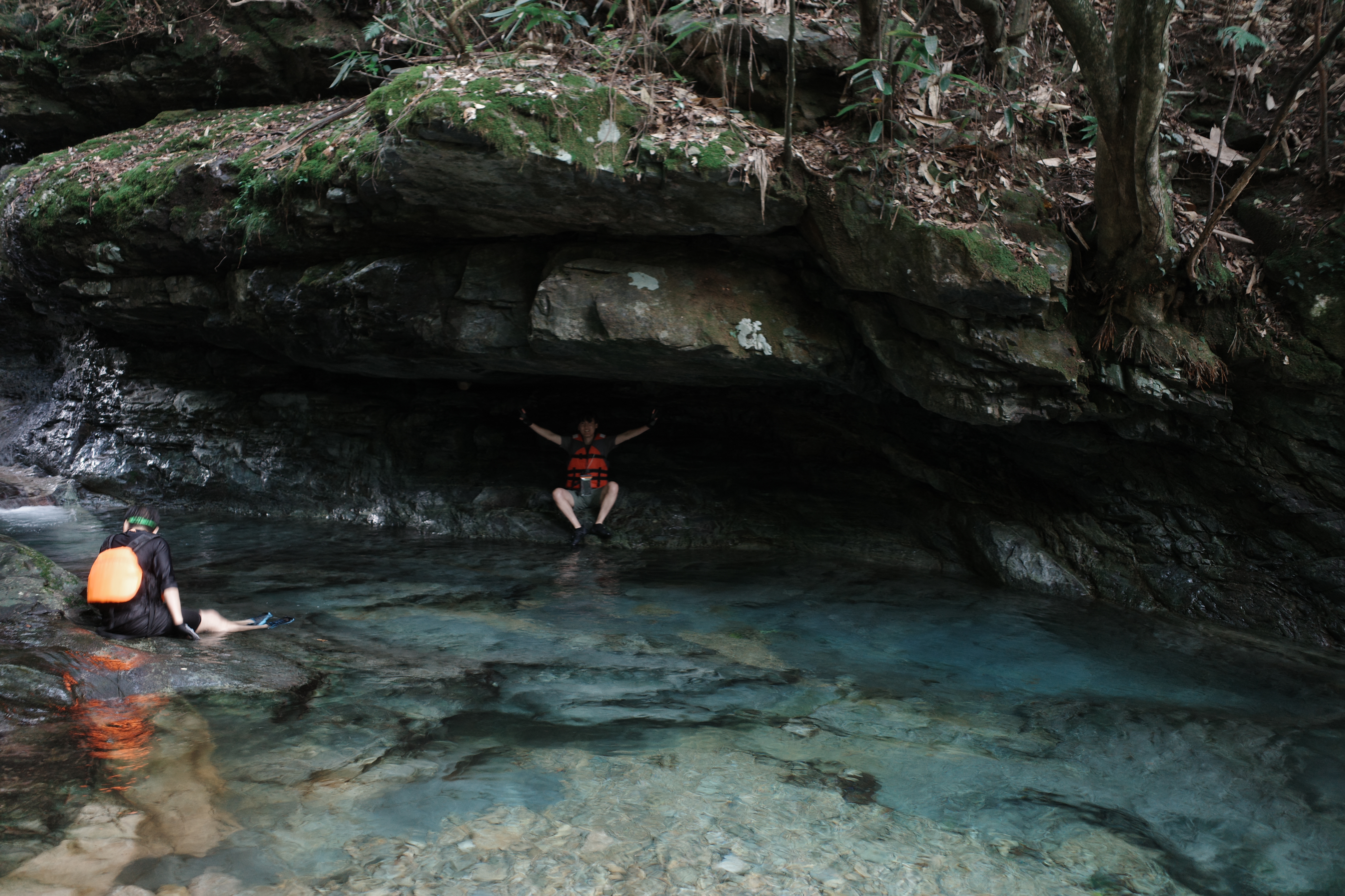 稍稍走几步便来到了鸣玉溪,溪上有一座颇为古朴的石桥名为果合桥。那时我还没去过牯牛降没见过世面,瞬间就被这蓝绿色的溪水吸引住了,孩子们在这里玩水玩的不想走。整个灵峰景区便是沿着这条溪流在两边的山上开凿步道,沿路可以看到千姿百态的山峰,洞穴,道观等景色。看到指示牌才知道原来这里还有专门的夜游路线,估计也就是主打一个石头的剪影。