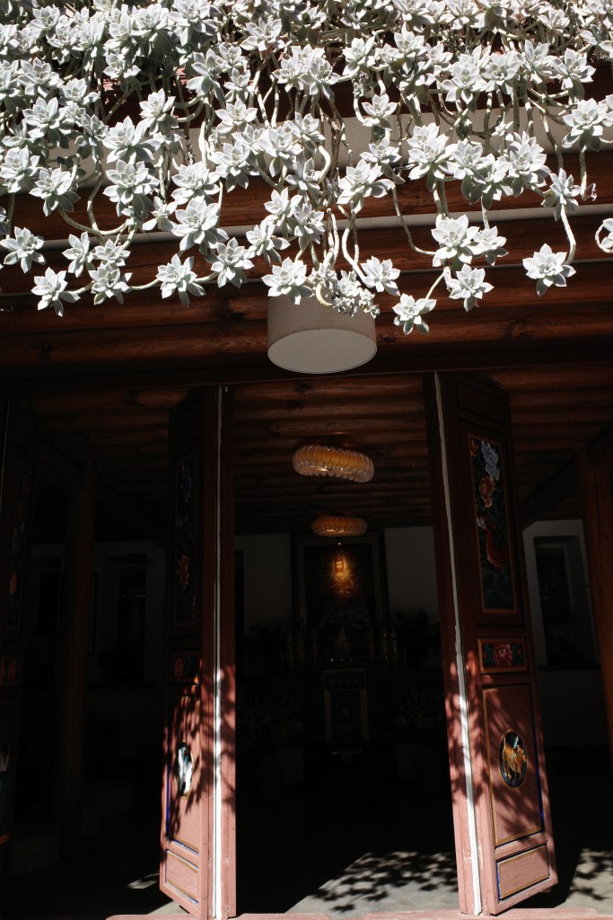 在最底下的感通寺吃了安静的午斋,想着就不去寂照庵排队凑热闹了。寂照庵原来是感通寺的一部分,两座寺院的名字源于:感而遂通,寂静照鉴。变成网红后,寂照不寂。虽然大多数游客还是轻言轻语,但是本该清净的茶室里,有人在打电话谈生意,有年轻的姑娘穿着超短裙摆出辣眼睛的姿势在自拍,斋饭排着长长的队… … 不过我想,在人群渐次散去,山寺重归寂静后,寂照庵绝对配的上中国最美尼姑庵的美称,庭院中生机勃勃的多肉们和各种鲜花铺天盖地,可见师傅们平时多么细心照料着他们。由原木,石块和青砖组成的整体架构,各个角落里看似随意摆放的老物件和小盆景,禅意的字画,使得这里保留了古朴的韵味,又因为改造后装上的巨大的玻璃窗,壁炉,使得整个空间特别地敞亮,通透,温暖。尤其是抄经房,茶室,咖啡馆,随便一框都很出片,成为大家的朝圣之地,也不足为奇。妙慧法师说,不管是改造前的无人问津,还是改造后的络绎不绝,对他们来说,每天的修行生活并没有实质的变化,而且寺庙被更多人喜欢就让更多人有了吃素的因缘。看,这就是修行之人的境界,而我这个俗人,眼里容不下沙子。外部世界不过是内心的幻化和投射,一点没错。