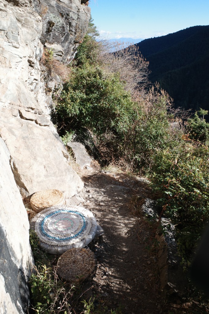 波罗洞在寺庙的后上方,攀爬一小段会到一个小平台,放着几个蒲团,在往上爬几步,就到了波罗洞所在地,从这里可以俯览群山环抱,树木掩映下的波罗寺屋瓦,是典型的三坊一照壁的白族民居式样。和尚拿开了波罗洞前遮挡着的板子,让我进去感受下,便离开了。我脱了鞋,双手合十礼拜后,到洞里打坐了一会,感觉很殊胜。