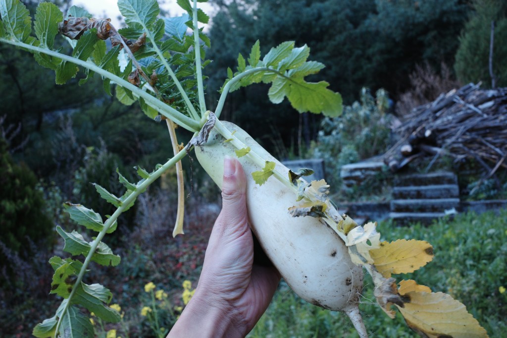 终究还是不够时间去莫残溪了,留待下次吧。回去的路上,和尚跟我讲了他怎么在这10多年间慢慢把这里修缮起来,包括铺路,开荒种地等等等等… 他看我一路上捡了几个松果,说你这些那么小的还不新鲜,快扔了,我那有特别特别好的一会送你。 于是,我就带着他给的硕大松果还有他从地里现拔的一颗白萝卜告别了他…