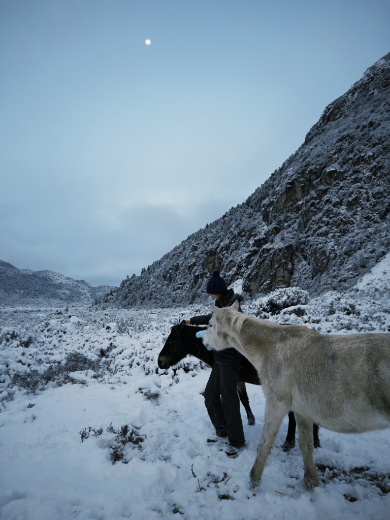 早上醒来,屋外大雪纷飞,天苍苍野茫茫… 他们去冰川,我决定留下来修整一天,事后看来这是一个非常英明的决策。这一天一定非常非常艰苦,瑞姐回来后都哭了。而我拿了涛哥的中华烟去和马帮套近乎,尬聊,吃了他们烤的油条,正宗的藏香猪,喝了酥油茶,回到自己的牛棚睡了一会儿… …如果没有这一天的休息,估计第四天都走不出去了吧。