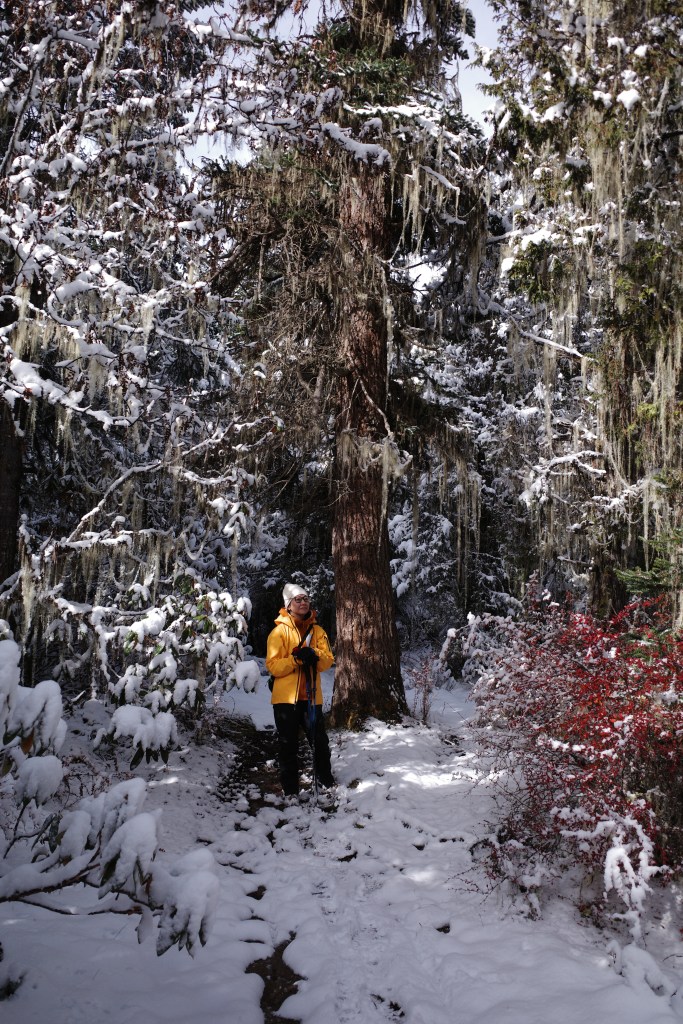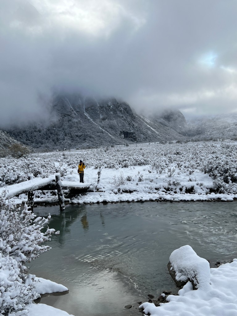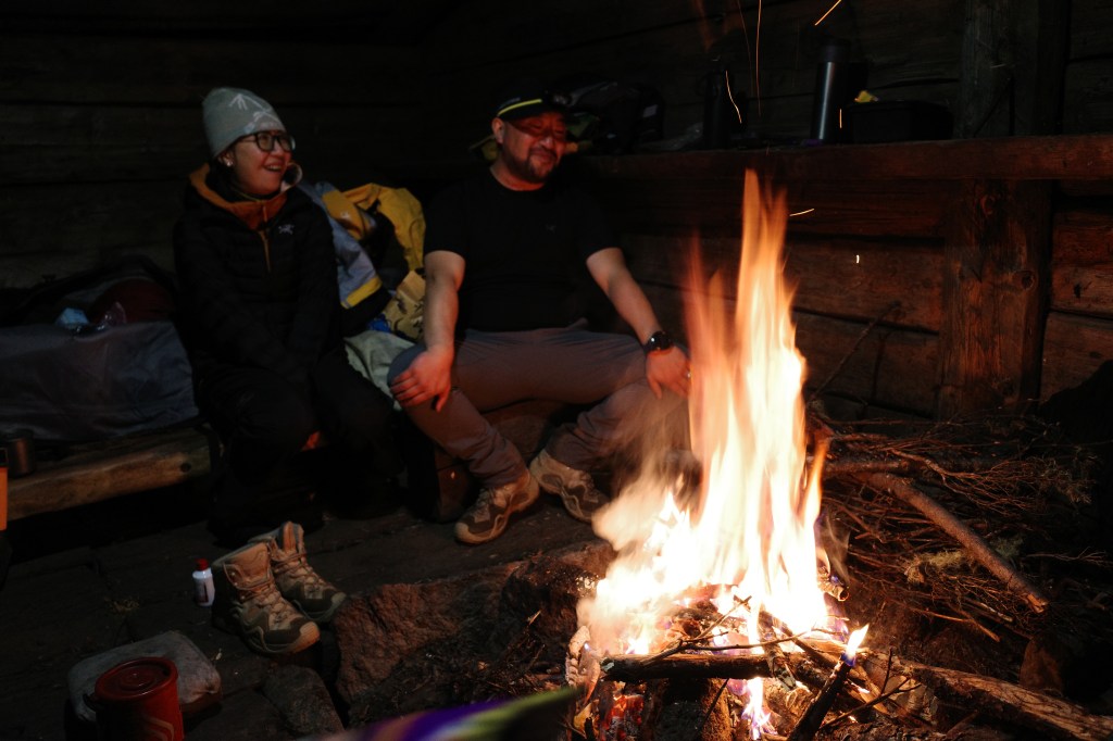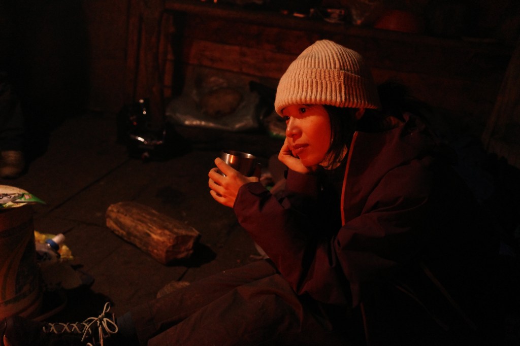 第二天一路上虽然是阴天,但是至少没有下雨。行程短,大家都走得比较轻松,凹凹造型,拍拍照。早早地到达营地后,天色尚早,大家伙就去四周转悠转悠,直到飘起了大雪,赶紧回到牛棚…晚上大家在我们的木屋烤火,玩着有点无聊的游戏一直到很晚。他们走后,我和阿抽方才能睡下。 这一晚真是刻骨铭心啊, 雪花透过屋顶的缝隙飘落到脸上,整个胃都非常非常难受,感觉里面塞满了一堆硬邦邦的泥土,堵地动弹不得…等胃好不容易慢慢松软下来,突然一大滩经血顺流而下,连抓绒裤都湿了… 整个人都不好了,被这种感觉硬控了十来分钟,我终于鼓起勇气从睡袋中钻出来,在乌七八黑中找到了手机打开了手电筒,在冰冷的空气中换好了卫生巾和一次性内裤… 这做完这些后,竟有种悲壮的自我感动。同时也很诧异,姨妈不但提前了不说,竟然在晚上还能有那么大的量。同屋的小抽一直问我怎么啦还好吗,有一个温柔的声音在一旁嘘寒问暖,感觉也没那么害怕。