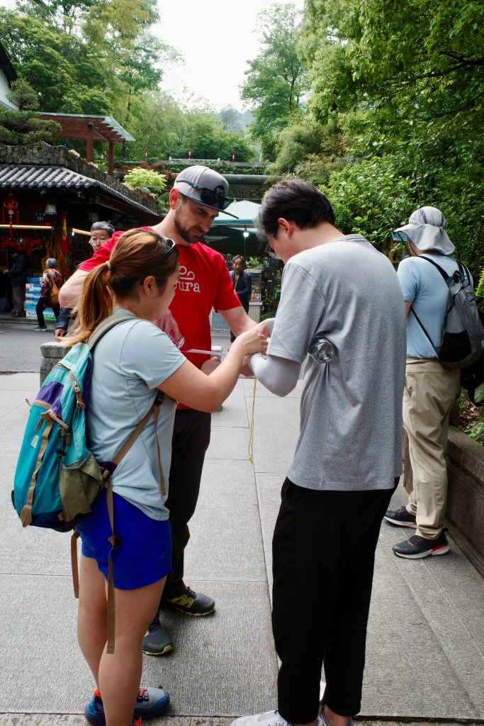 为了对活动细节了然于胸,我提前一天去了杭州踩线,顺便把小抽约了出来。 她的脑袋瓜还是比我的要灵光不少,细雨蒙蒙中,两个人一下午漫步在龙井和九溪,边叙旧边琢磨和实践指北针的用法,终于慢慢有了些概念,晚上睡觉前还借助AI 应对了一些暖场活动,包括沿途经过的寺庙和茶文化的英文解说(因为团队中唯一的一位法国大老板会跟着我的小分队),终于可以比较踏实地睡下了。
